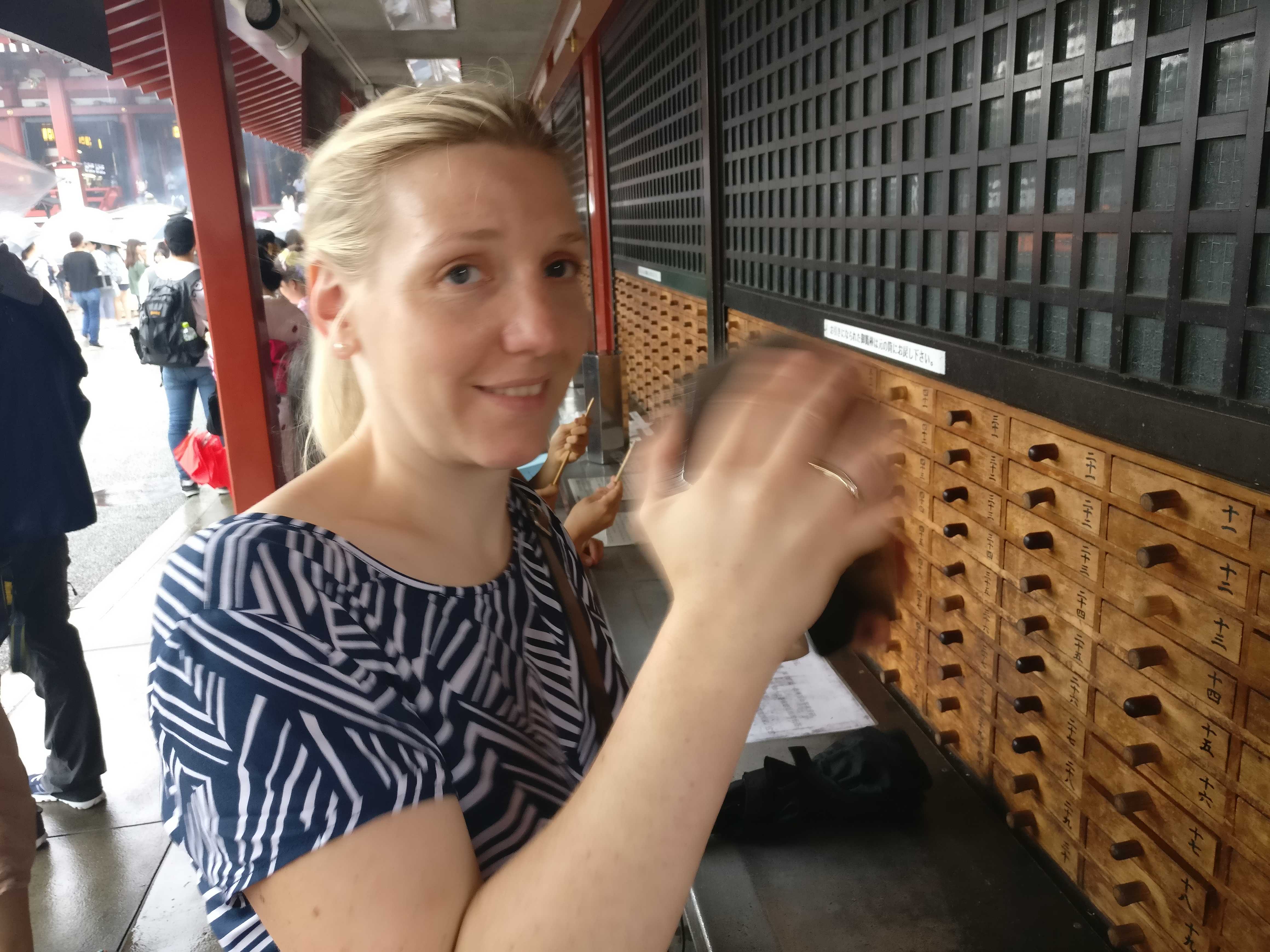 Ein paar Meter weiter kann man sich seine Zukunft vorhersagen lassen. Dazu schüttelt man aus einem Behälter ein Stäbchen mit einem Schriftzeichen heraus.