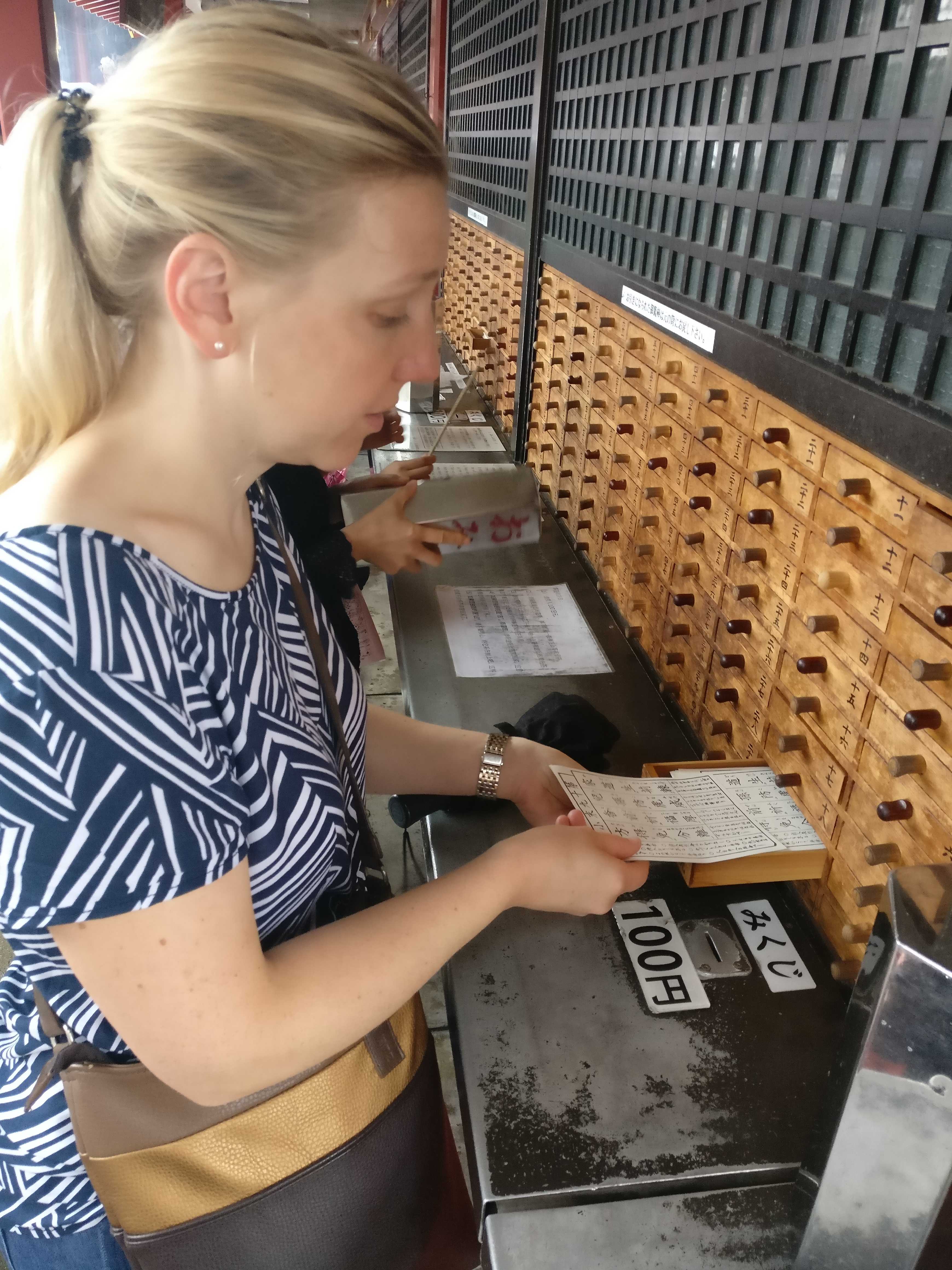 Dieses Zeichen sucht man dann an den Schubladen und nimmt sich seine Weissagung heraus. Gefällt einem die Zukunftsaussicht, kann der Zettel behalten werden. Sollte jedoch eine negative Voraussagung herauskommen, ist das auch kein Problem. Man faltet einfach den Zettel und knotet ihn an speziell dafür aufgestellte Gestelle, die von Priestern regelmäßig geleert werden und ihn deren Gebete mit eingebaut werden. So kann man trotzdem freudig in die Zukunft schauen.